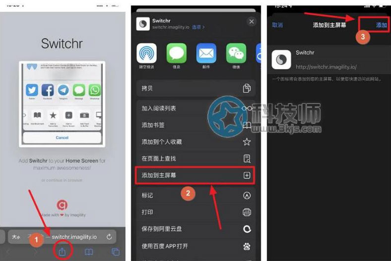 2、如上图所示,使用iPhone、iPad上的Safari打开该工具官网,然后点击上图图示标注1的所示的分享按钮,然后点击上图图示标注2所示的“添加到主屏幕”按钮,然后点击图示标注3的“添加”按钮将其添加到主屏幕上;