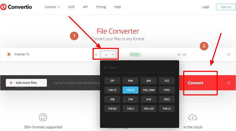 3、如上图所示,我们以转换7z压缩文件为例,将文件上传上去后,点击图示标注1所示的下拉条,设置需要转换的格式,设置好格式之后点击“Convert”按钮就能开始转换了,剩下我们要做的就是等待格式转换完成,完成后将转换好的文件下载到本地使用。