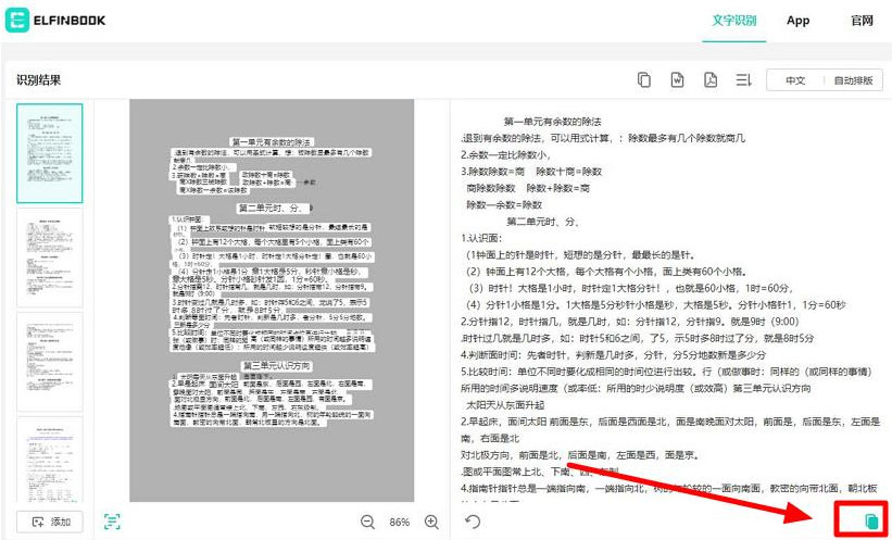 3、文件上传成功后会跳转到文字识别界面,如上图所示,我们可以直接在界面中看到文字识别的结果,预览下来没什么问题只需要点击图示箭头标注的复制按钮就能复制ocr识别的文字直接使用了,非常方便吧。