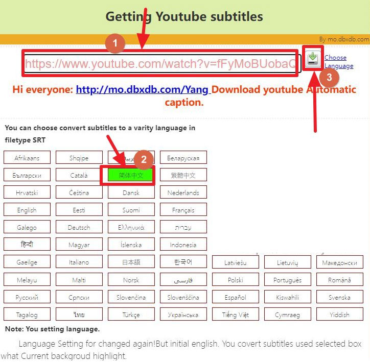 2、打开该在线工具后,如上图所示,我们在文本框中输入需要下载字幕的油管视频地址,然后设置需要下载的字幕语言,最后点击图示标注3所示的下载按钮;即可将油管视频的字幕文件下载到本地了。