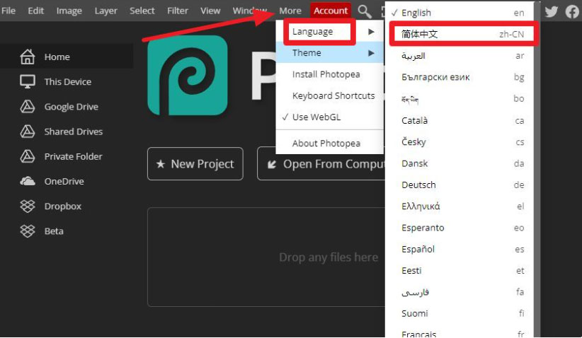 2、打开后该在线工具后如上图所示,我们点击菜单栏上的more,然后进入弹出菜单的“Language”,接着点击选择“简体中文”,这样就能把界面设置为简体中文界面了。