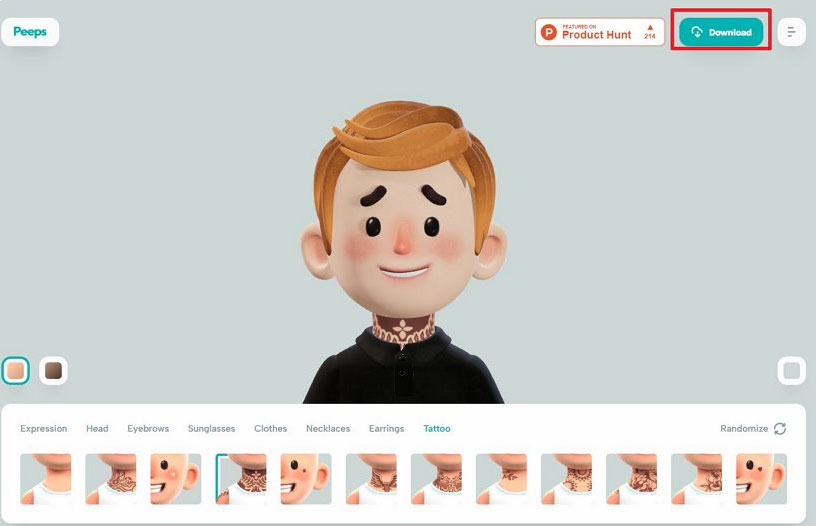 Peeps是一个用于在线制作头像的免费工具,能够帮助我们非常方便的实现头像在线制作,并且完全免费 ,可以制作生成3D形式的头像,可以自定义非常多的头像元素,包括表情、头型、眉毛、太阳镜、衣服、项链、耳环、纹身等,每一项都有足够丰富的选项可选择使用,完全能够让你制作出非常有个性的3D效果的头像。