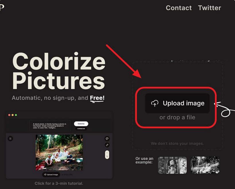 2、打开该在线工具后如上图所示,我们点击图示标志所示的“Upload image”按钮,上传需要上色的黑白图片或是照片;