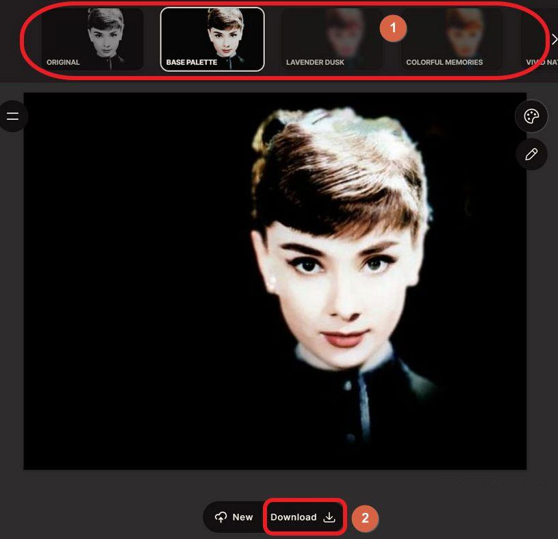 3、等待图片照片上传完成后,该在线工具会自动进行AI运算,给出上图所示的基础彩色上色方案(Base Palette),我们还可以在图示标注1所示的彩色方案区域进行一键切换,更改彩色上色方案,彩色处理完成后觉得满意的话,点击图示标注2所示的“Download”按钮即可将彩色处理好的图片照片下载到本地了。