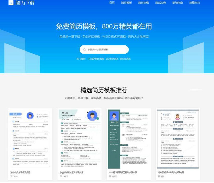 2、如上图所示,我们可以通过该网站自带的搜索功能搜索自己想要的简历模板,也可以通过进入“简历模板”板块,按照分类浏览查看找到自己喜欢的简历模板下载,下载到本地后直接填写自己的相关信息就能制作出自己的简历了。