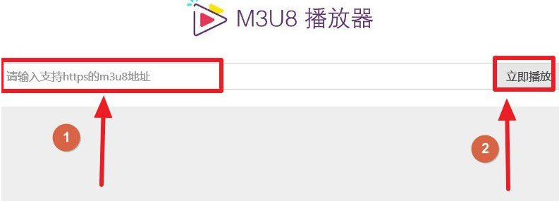 2、打开后如上图所示,我们在图示标注1所示的地址栏中输入m3u8网址,完后点击图示标注2所示的“立即播放”;