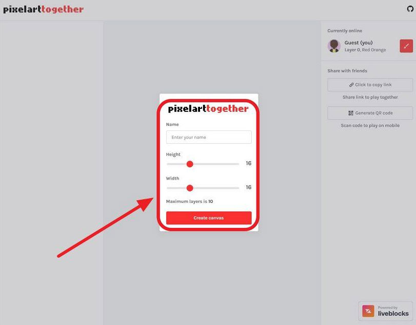 2、打开该在线工具后如上图所示,我们在图示标注的设置选项中设置自己的昵称、像素画的高度和宽度,然后点击”Create canvas”按钮进入像素画制作界面;