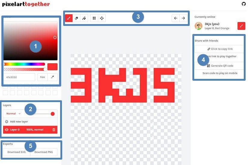 pixelarttogether是一个在线版本的像素画生成器,可以帮助我们方便快速的在线制作生成自己想要的像素画,我们可以直接通过网页浏览器来设计制作并生成像素画,操作简单方便,无需专业的绘画技能和知识也能轻松进行像素画创作,除了能够将绘制生成的像素画下载到本地,该在线工具还支持将制作生成的像素画的在线协作网址快速分享给朋友们来一起协作创作,只需要复制链接或者二维码发给别人即可,很方便。