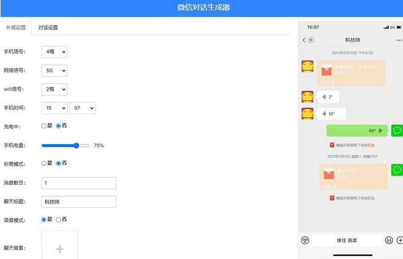 微信对话生成器是一个免费微信对话在线制作的在线工具,能够帮助我们在线制作微信对话内容截图,并且完全免费,无论是要达到秀恩爱、秀实力还是秀逼格的目的,通过这个在线制作微信对话截图的工具,都能够帮助我们轻松搞定,避免了别人有的秀,自己没得秀的尴尬。