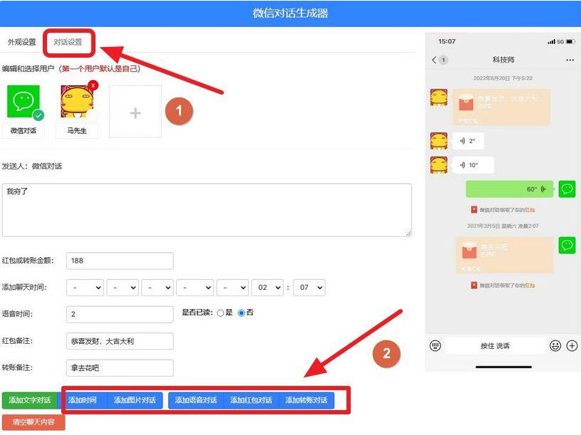 3、如上图所示,点击图示标注1所示的“对话设置”即可开始自定义微信对话内容了,我们可以设置对话用户头像,添加文字对话、添加时间、添加图片对话、添加语音对话、添加红包对话、添加转账对话,制作好之后只需要将图片右侧的微信对话图片保存到本地即可使用了。