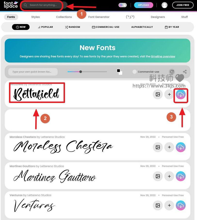 2、打开该在线网站后如上图所示,我们可以直接通过图示标注1所示的搜索框来搜索字体,也可以直接点击图示标注2所示的字体查看该字体的详细信息,或是点击字体后面图示标注3所示的下载按钮直接下载对应的字体。