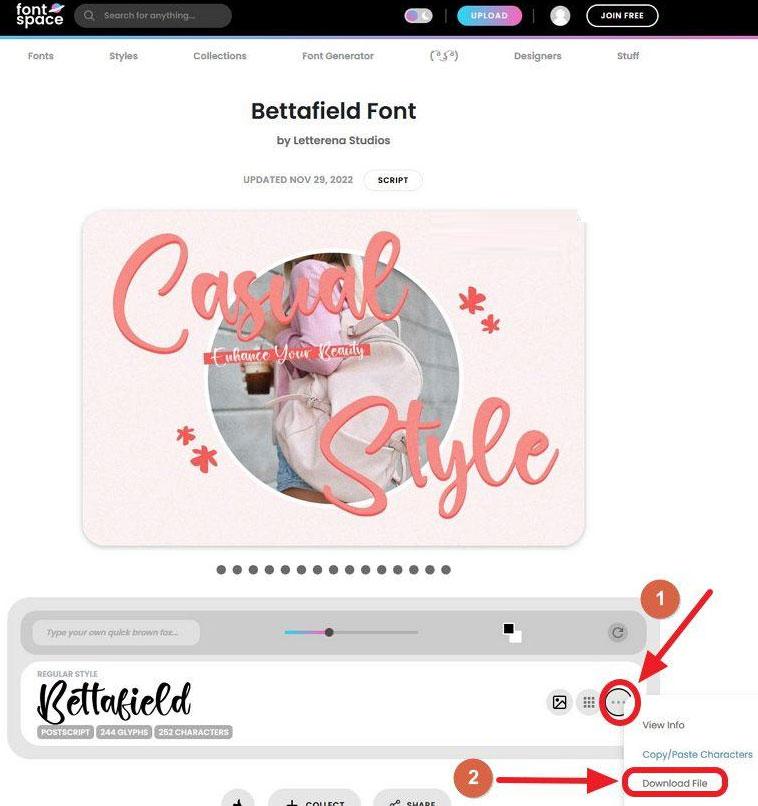 3、字体详情页面如上图所示,我们可以直接在该页面查看该字体的一些应用案例,想要下载字体的话点击图示标注1所示的三个点按钮,然后点击弹出菜单的“Download File”按钮,即可将该字体下载下来了。