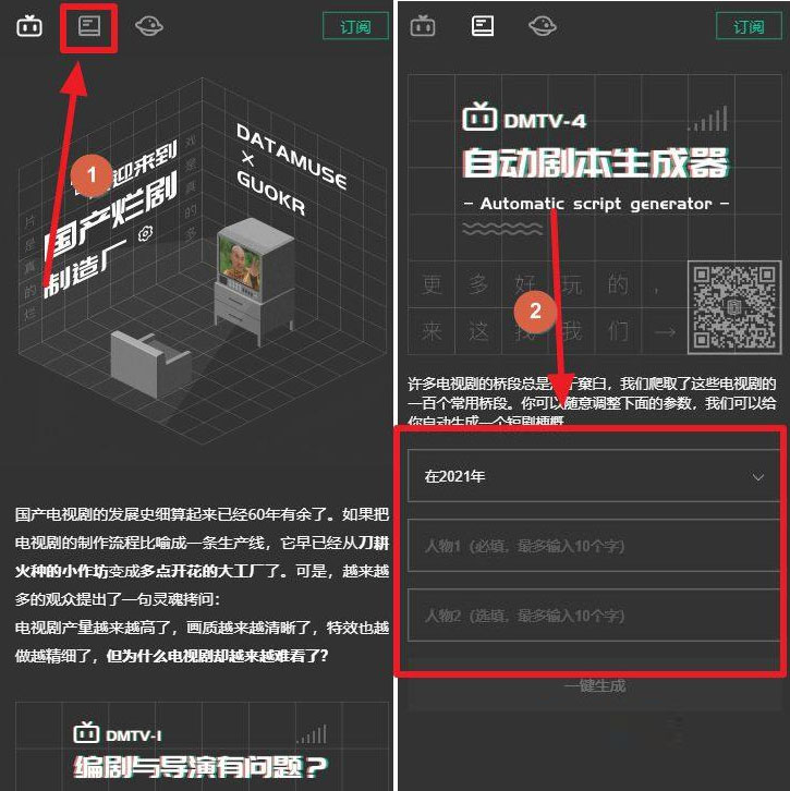2、打开后如上图所示,我们点击图示标注的菜单项进入该剧本生成页面,我们在图示标注2所示的文本框中设置好剧本发生的故事年份,人后设定好人物1和人物2,最后点击“一键生成”;