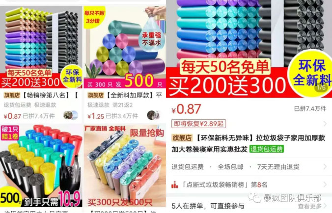首先我们可以去闲鱼之外的任何平台去找这种低价的垃圾袋,基本上拼夕夕上比较便宜对吧,我们把拼夕夕上面的垃圾袋图片全都保存下来,把垃圾袋的标题和商品介绍也复制下来。