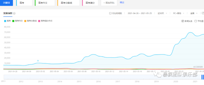 当然线上的搜索一定也不少,我们从百度指数里也能看出大家对这个考试的一个搜索需求,现在的这个时间正值高考季,除了各科成绩的辅导之外,像针对性的心理辅导、饮食辅导等等,也是一个非常大的需求。