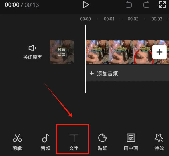 2、在底部或顶部的工具栏中,找到并点击“文字”选项。
