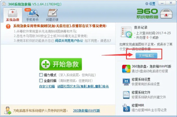 2.然后,在360急救箱的主界面右上角找到“文件隔离区”选项,这里会列出所有被识别为疑似木马或其他潜在风险的文件。