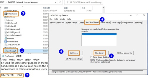 4. 打开网络许可配置程序【lmtools.exe】,停止再启动中望授权服务,设置生效。