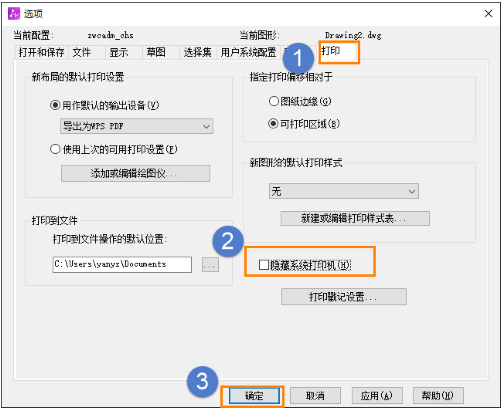 1.点击菜单【工具-选项】(【OPTIONS】命令),在【打印】页面,【隐藏系统打印机】取消勾选,然后再点击【确定】。