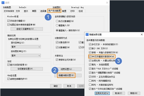 3. 在【用户系统配置-隐藏消息设置】里,将【DWG文件重新关联到ZWCAD】勾上;
