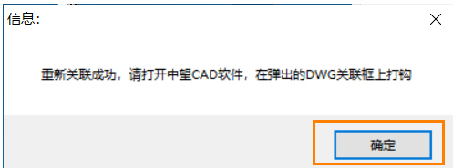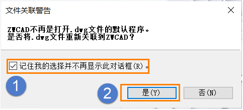 4. 关闭中望CAD,重新启动,软件弹出”文件关联警告“,勾上【记住选择】,并点击【是】,重新建立文件关联。