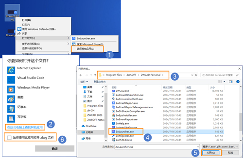 2.如打开方式不能直接找到,点击【选择其他应用-在这台电脑上查找其他应用】,在中望CAD安装目录下找到【ZwLauncher.exe】打开,勾选【始终使用此应用打开.dwg文件】即可。