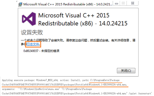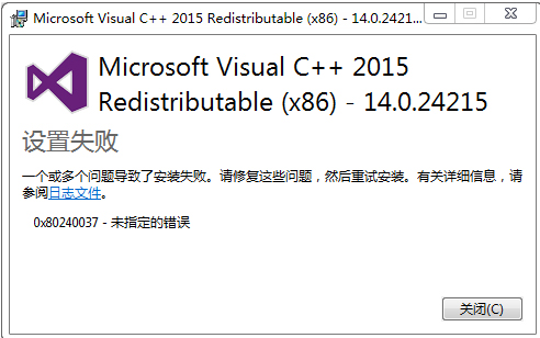 在启动CAD提示:"无法启动此程序,因为计算机丢失mfc140u.dll"。此时需要安装VC++2015,但安装过程失败,出现以下提示: