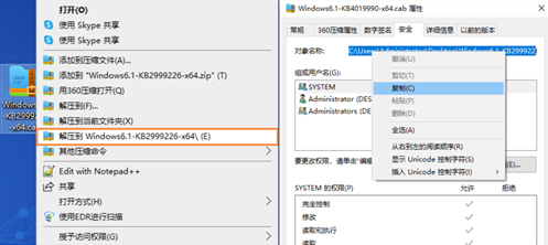 3.将该压缩包右键-解压到windows6.1-KB2999266-x64(如没有解压软件,需要临时安装一款),打开解压后的文件夹,选中里面【Windows6.1-KB4019990-x64.cab】文件,【右键】-【属性】-【安全】-复制该文件路径。