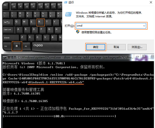 4.打开【运行】(可通过键盘的【win+r】键来调出该窗口),输入【cmd】打开命令行窗口。在命令行输入:dism /online /add-package /packagepath:"C:\Users\Administrator\Desktop\Windows6.1-KB2999226-x64\Windows6.1-KB4019990-x64.cab"(红色部分为复制的路径), 按【Enter】键,开始安装该文件。等待程序包进度到100%即安装成功。
