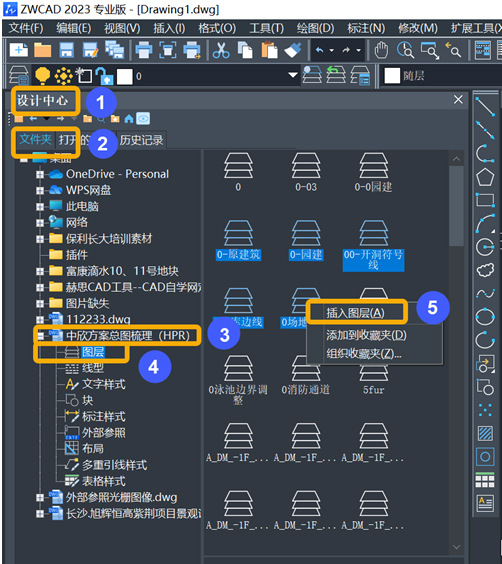 c.在【图层】选项,按住SHIFT键,选中需要复用的图层,点击鼠标右键,选择【插入图层】,图层就成功插入到当前图纸文件中。
