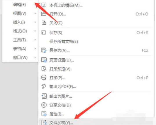 在下拉菜单中,依次点击 【文件】→【文件加密】(部分版本可能直接显示为【文档加密】)。