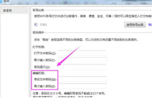 切换到 【编辑权限】 选项卡。输入 【修改文件密码】(即修改文档时需输入的密码)。再次输入相同密码确认(【再次键入密码】)。